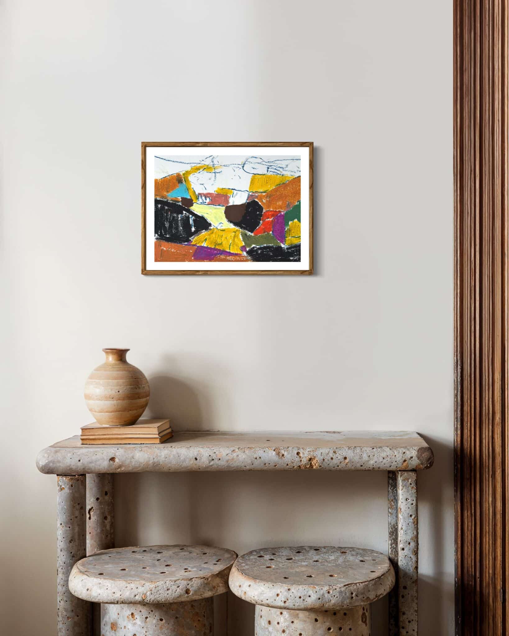 Skitsen er udført på 300 g akvarelpapir (31 x 41 cm) og leveres indrammet med passepartout i lyst egetræ.
